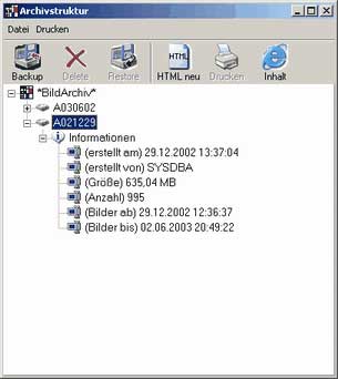 Strukturansicht Hier sehen Sie physikalische Struktur des Archives. Sie können Backups der Daten auf Speichermedien abgelegen und anschließend die Bilder von der Festplatte löschen (wenn der Platz zu knapp wird). |